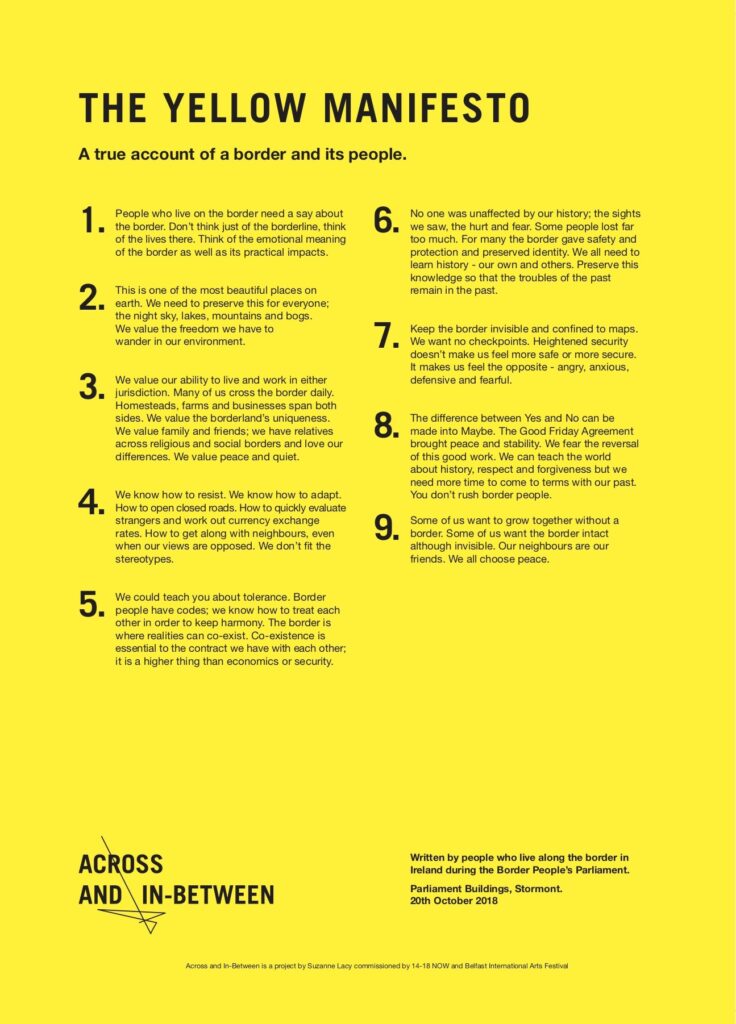 From 16th to 23rd October, 2018, it was presented as a live artwork in process at Belfast International Arts Festival as part of the closing season of 14-18 NOW: staging the performance of the Border People’s Parliament in Stormont; drafting The Yellow Manifesto; and concurrently projecting The Yellow Line at scale upon the façade of the Ulster Museum.