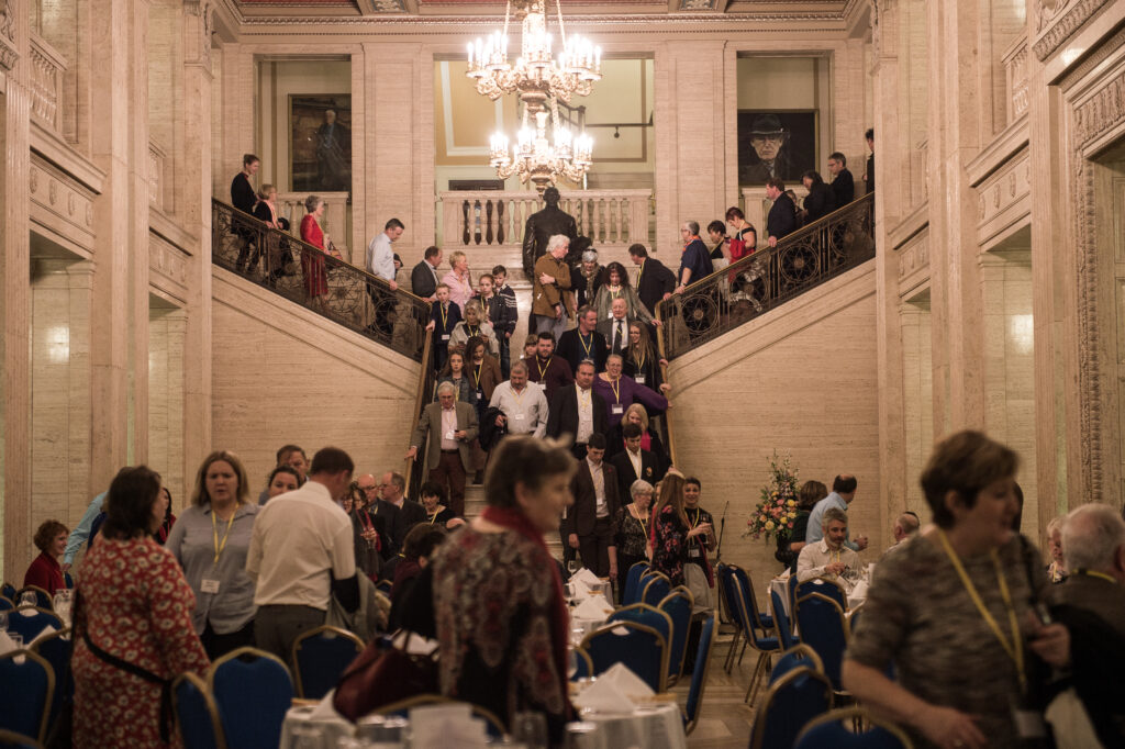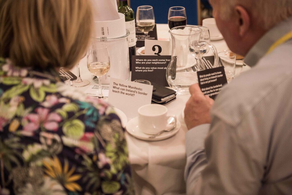 Border People’s Parliament – At the height of the Brexit crisis, 150 people arrived at Northern Ireland’s Parliament Buildings, Stormont, for a Border People’s Parliament. On 20th October 2018, guests were part of a carefully staged event, their opinions recorded in Parliamentary committee rooms and their photographic portraits captured. Over dinner they participated in drafting The Yellow Manifesto- A True Account of a Border and its People launched on the Today programme, BBC Radio 4, 22nd October, 2018.